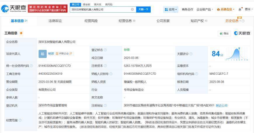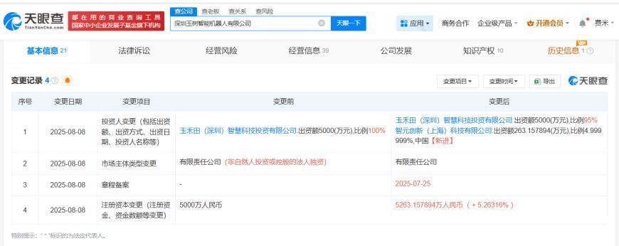 天眼查显示,近日,深圳玉树智能机器人有限公司发生工商变更,新增智元机器人关联公司智元创新(上海)科技有限公司为股东,同时注册资本由5000万人民币增至约5263万人民币。